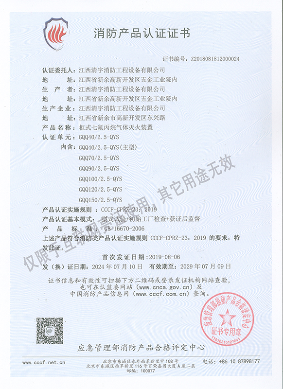 • 七氟丙烷滅火裝置認(rèn)證證書